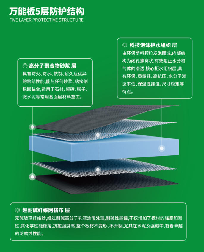 一种新型装修基层板材,其双面采用复合耐碱纤维网格布的高分子聚合物抹面胶浆为薄抹面层制作而成的高性能复合板。